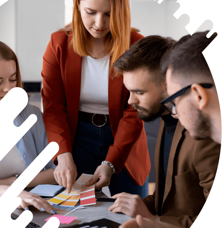 Group of tech professionals in a modern meeting discussing recruitment strategy