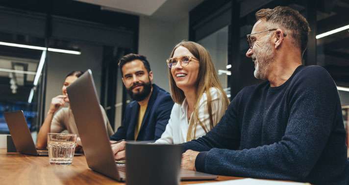 Group of tech professionals in a modern meeting discussing recruitment strategy